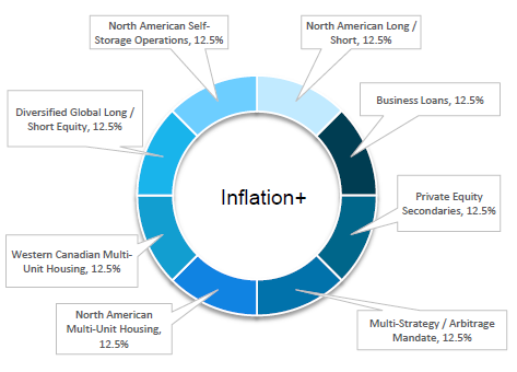 The 50% Growth+ / 50% Inflation+ Portfolio combines the Growth+ strategy's global investing themes with the Inflation+ strategy's focus on low volatility growth and inflation protection. Investors enjoy diversified exposure that aims to benefit from both growth opportunities and a hedge against inflation. With a medium risk level, this portfolio seeks to strike a balance between capital appreciation and protection, making it a dynamic choice for investors navigating changing economic landscapes.